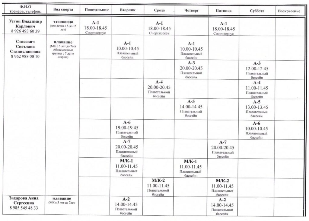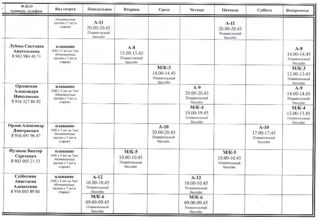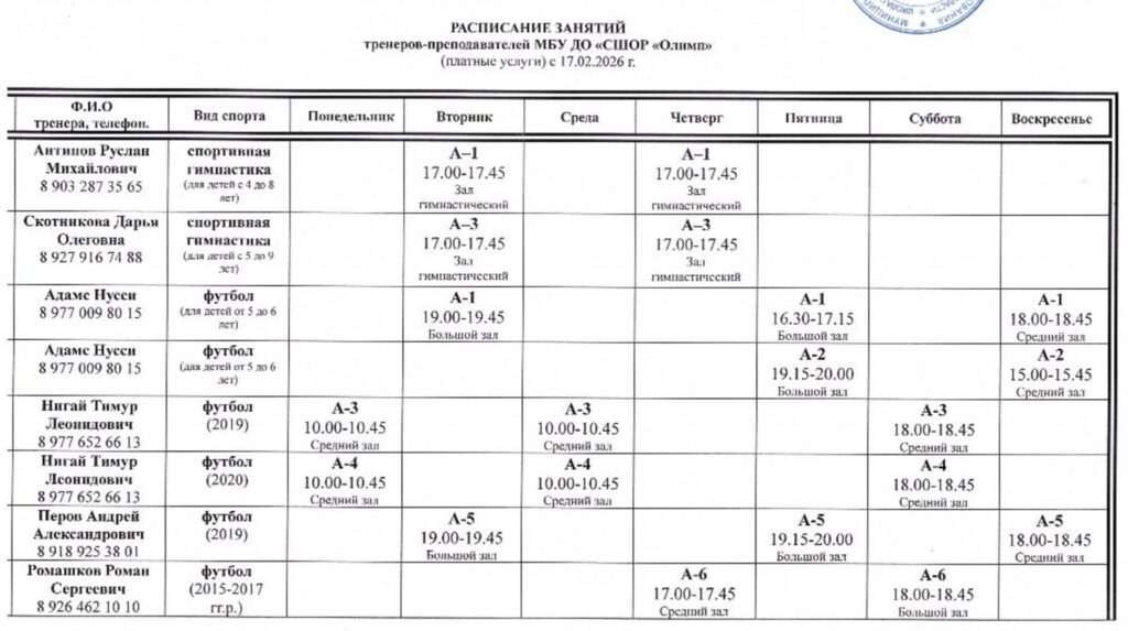 Расписание зянятий тренеров МБУ ДО СШ Олимп г.о. Фрязино (платные услуги) с 17 февраля 2026 года.